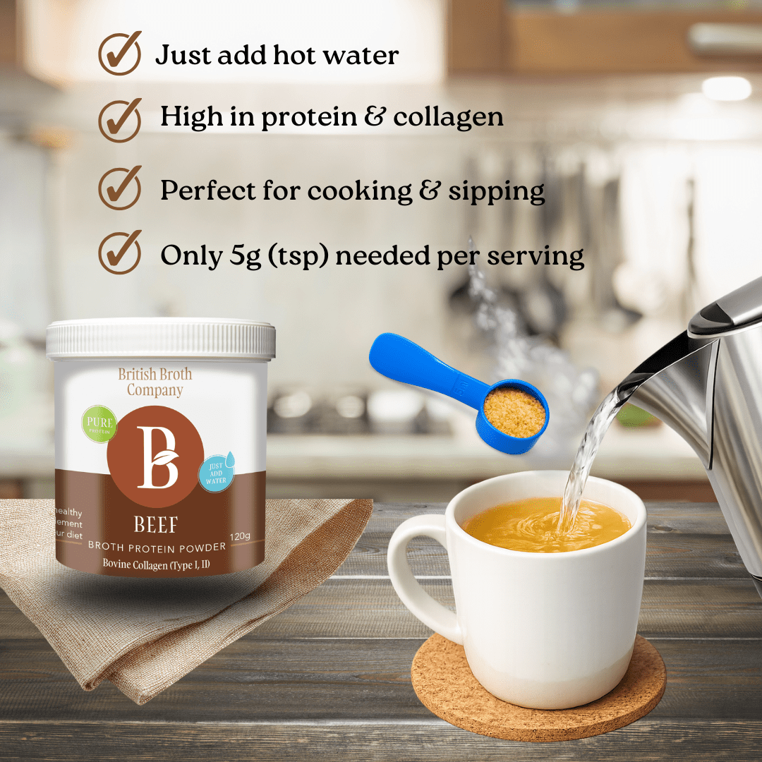 How to Use: Add 1 tsp/scoop of broth to your mug. Pour in boiling water and stir for 1 minute.