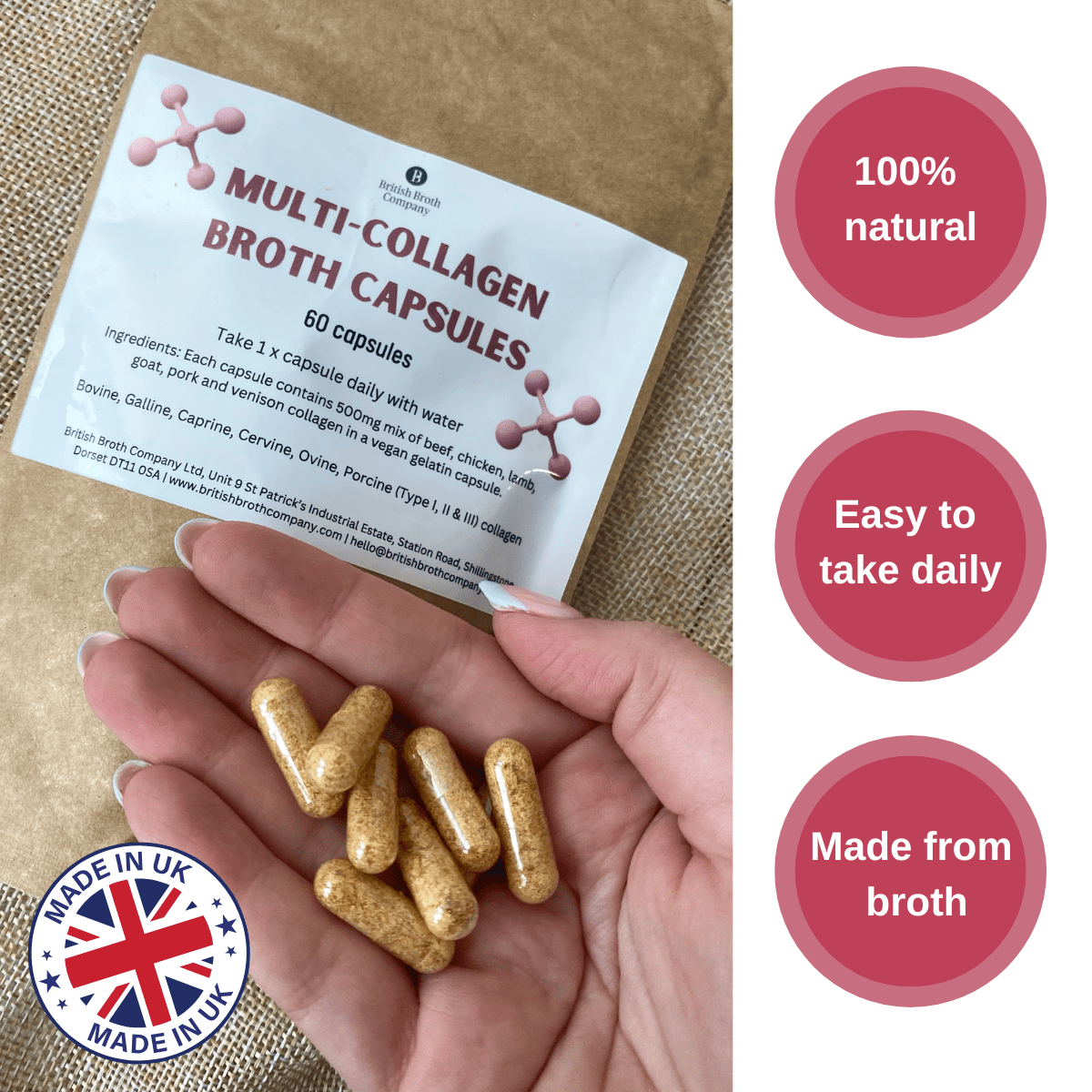 Ingredients: Beef, Lamb, Chicken, Goat & Venison bone broth dehydrated in a vegan gelatin capsule (not hydrolysed).